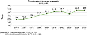 100 matrimonios ocurrieron 32.9 divorcios. Esta relación aumentó en 14.3 entre 2013 y 2022. En 2020, año que coincidió con el inicio de la pandemia por la COVID-19, la relación descendió.