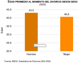 De acuerdo con la información registrada durante 2022, en México, las mujeres se divorciaron ligeramente más jóvenes que los hombres. La edad promedio al momento del divorcio fue de 40.6 y de 43.0 años, respectivamente.
