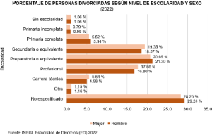 Al momento del divorcio, la mayoría de las y los divorciantes manifestó contar con preparatoria o equivalente. A las mujeres correspondió un 20.69 % y a los hombres, 21.3 por ciento. Siguió, en ambos casos, el nivel secundaria, con 19.35 % en el caso de las mujeres y 18.57 % en el caso de los hombres. Por lo que respecta al nivel profesional, 17.66 % de las mujeres refirió contar con este, así como 16.8 % de los hombres. La clasificación otra refiere a personas que tomaron capacitación, en especial para un trabajo específico, lo que puede o no reconocerse por la Secretaría de Educación Pública (SEP).