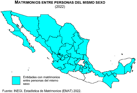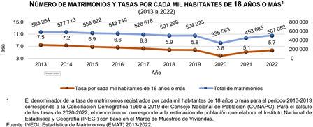 Para 2022, la información que integró la EMAT provino de 4 mil 709 oficialías del Registro Civil. Se registraron 507 mil 052 matrimonios, con lo que se obtuvo una tasa nacional de 5.7 matrimonios por cada mil habitantes de 18 años o más. En 2013 la tasa fue de 7.5.