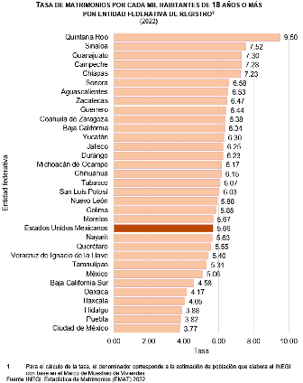 Las entidades federativas con las tasas más altas de matrimonios por cada mil habitantes de 18 años o más, fueron Quintana Roo, con 9.50; Sinaloa, con 7.52 y Guanajuato, con 7.30. Las que presentaron las tasas más bajas fueron: Ciudad de México, con 3.77; Puebla, con 3.82; e Hidalgo, con 3.88.