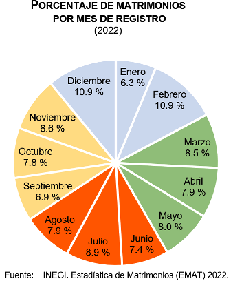 En diciembre y febrero de 2022 se registró el mayor número de matrimonios, con 10.9 % (55 mil 503 y 55 mil 387, respectivamente). Siguió julio, con 8.9 % (45 mil).