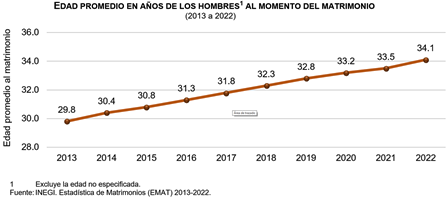La edad promedio al casarse ha aumentado. En los hombres cambió de 29.8 años, en 2013, a 34.1, en 2022.