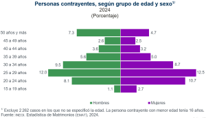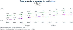 En 2015, la edad promedio de las mujeres al momento de contraer matrimonio fue de 27.9 años; en 2024, fue de 32.1. En los hombres pasó de 30.8 años en 2015 a 35.0 en 2024. En matrimonios entre personas del mismo sexo, las mujeres reportaron una edad promedio al momento de casarse de 34.7 años; los hombres, de 37.1 años.