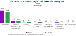 Respecto a la condición de actividad económica, 57.7 % de las mujeres y 94.6 % de los hombres declararon tener trabajo al momento de contraer matrimonio. Entre contrayentes que trabajaban, la principal posición en el trabajo fue empleada o empleado: a las mujeres correspondió 77.0 %; a los hombres, 69.2 por ciento. Siguió persona trabajadora por cuenta propia: 14.2 % correspondió a mujeres y 13.0 %, a hombres.