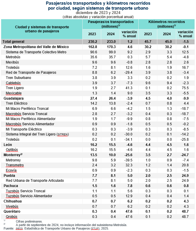 Durante diciembre de 2024, el sistema de transporte urbano de la Zona Metropolitana del Valle de México —que se integra por las 16 alcaldías de Ciudad de México y los municipios conurbados del estado de México con los que se comparte transporte— prestó servicio a 170.3 millones de pasajeras y pasajeros, cantidad 4.6 % mayor que la del mismo mes de 2023. La distancia que cubrió el sistema fue de 30.2 millones de km, cifra que decreció 0.1 % en su comparación anual.