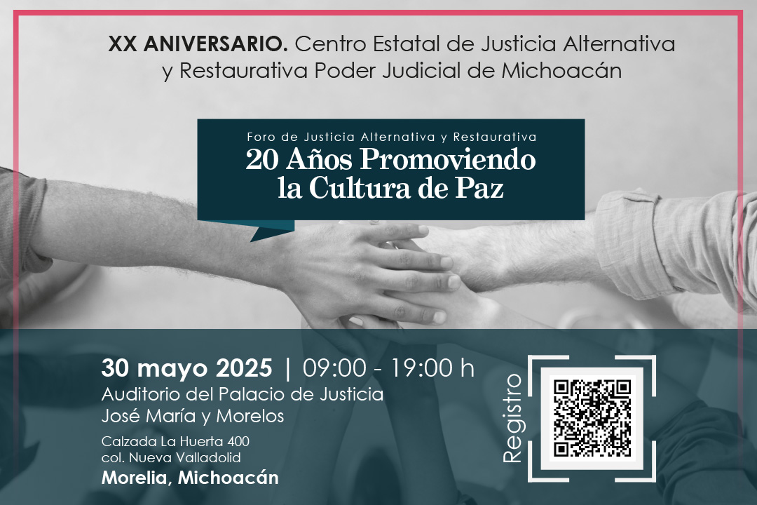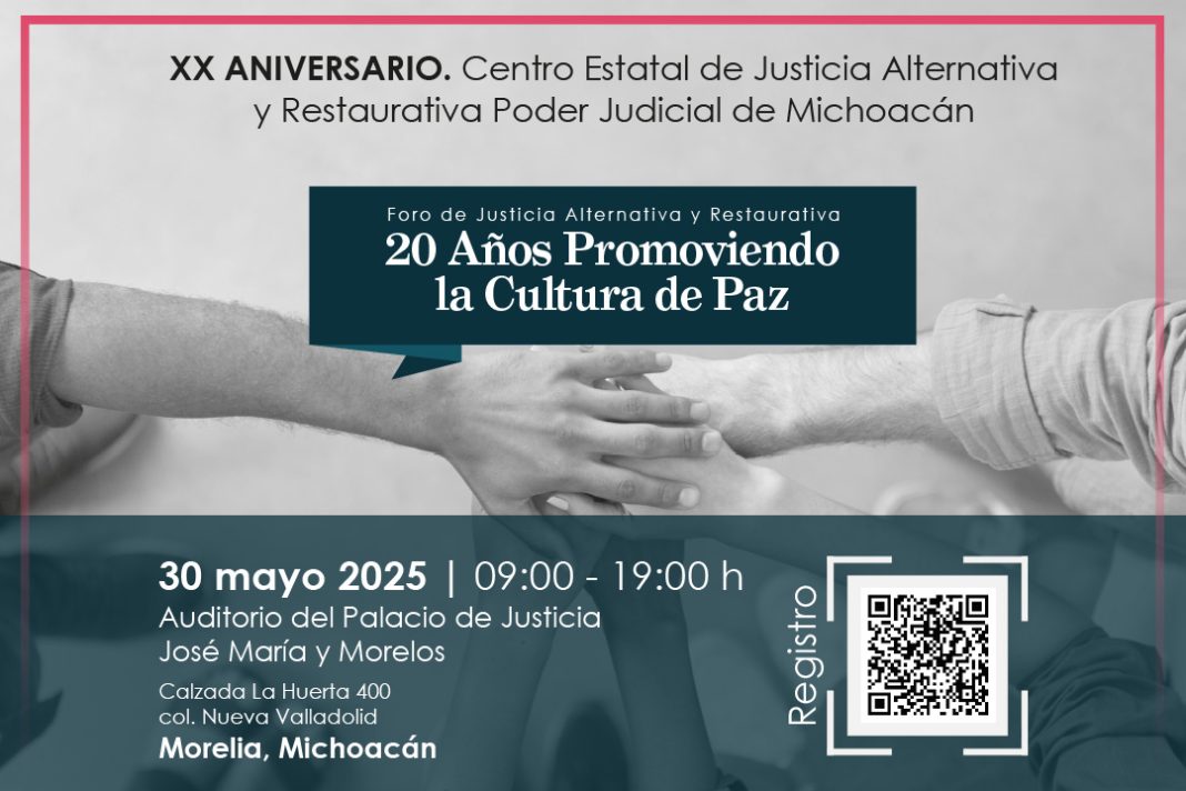 El Poder Judicial de Michoacán llevará a cabo el Foro de Justicia Alternativa y Restaurativa “20 Años Promoviendo la Cultura de Paz” conmemorativo por el vigésimo aniversario del Centro Estatal de Justicia Alternativa y Restaurativa (CEJAR), en el que especialistas compartirán sus experiencias, reflexiones y aportaciones sobre los retos y avances en la solución pacífica de conflictos.