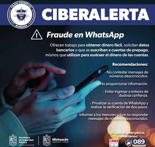 Derivado del monitoreo permanente y de la atención a denuncias ciudadanas, el personal de la Policía Cibernética de la Secretaría de Seguridad Pública (SSP), alerta a la ciudadanía por un fraude difundido en la red social de ‘WhatsApp’.