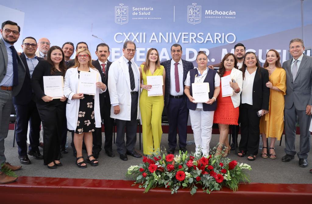 Morelia, Michoacán.- En el marco del CXXII Aniversario del Hospital General Dr. Miguel Silva, el secretario de Salud de Michoacán, Elías Ibarra Torres, distinguió a 280 trabajadores por su desempeño y compromiso con la salud de la población, acción que ha permitido colocar al centro médico como uno de los mejores del estado.