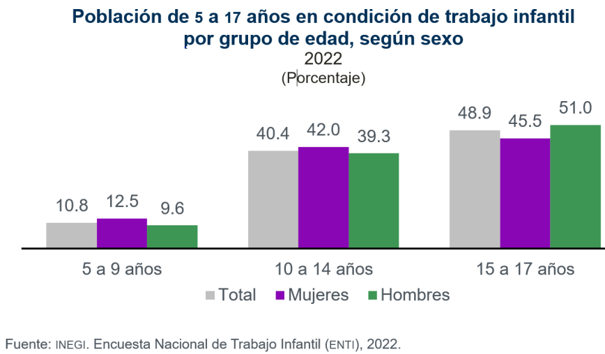 De acuerdo con la ENTI 2022, en México residían 28.4 millones de niñas, niños y adolescentes de 5 a 17 años, de los cuales, 3.7 millones (13.1 %) se encontraban en condición de trabajo infantil: 39.8 % pertenecía al grupo de mujeres y 60.2 %, al de hombres.