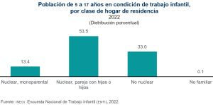 Del total de personas en trabajo infantil, 53.5 % vivía en hogares nucleares -hogar de tipo familiar conformado por una pareja con hijas o hijos-; 33.0 % en hogares no nucleares de tipo familiar -se refiere a los que incluyen al hogar nuclear más uno o más familiares (hogares ampliados) o al hogar nuclear más personas que no guardan parentesco con el hogar nuclear (hogares compuestos)-; 13.4 % en hogares nucleares monoparentales -se refiere al de tipo familiar conformado por un padre o madre y sus hijas o hijos-, y 0.1 % en hogares no familiares -los que están formados por una persona o por personas sin parentesco entre sí-.