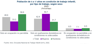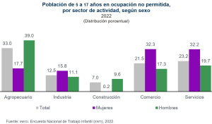 En 2022, de los 3.7 millones de niñas y niños en trabajo infantil, 2.1 millones (57.1 %) realizaban ocupaciones no permitidas. De estos últimos, 56.7 % estaba en ocupaciones consideradas peligrosas y 43.3 % se encontraba por debajo de la edad mínima para trabajar.