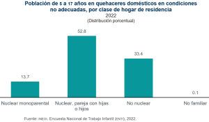 En 2022, de las niñas y niños en trabajo infantil, 1.9 millones realizaban trabajo doméstico en condiciones no adecuadas: 51.8 % eran mujeres y 48.2 %, hombres. Por grupos de edad, este tipo de trabajo infantil se concentró en la población de 10 a 14 años, con 43.2 % y en el grupo de 15 a 17 años, con 42.2 por ciento.