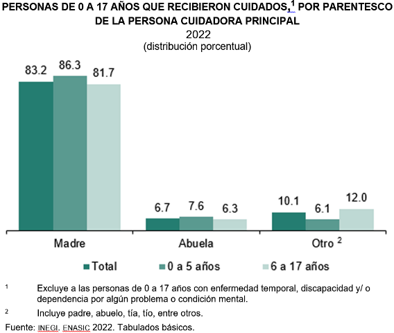 La persona cuidadora principal -cuidadores que forman parte del mismo hogar- de niñas y niños de 0 a 17 años fue la madre (83.2 %). Siguieron abuela (6.7 %); y otra persona (padre, tía, tío, abuelo, etcétera, con 10.1 %). El grupo de 6 a 17 años requirió un porcentaje mayor de otros cuidadores (padre, abuelo, tía, tío, etcétera) si se lo compara con aquellos que cuidaron a la población de 0 a 5 años.