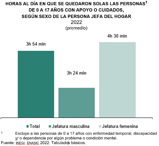 De las personas de 0 a 17 años que requirieron cuidados, 11 de cada 100 se quedaron solas en casa en algún momento del día. Este porcentaje se incrementó (15.3 %) cuando la persona jefa del hogar era una mujer. De las niñas y niños con cuidados y que se quedaron solas o solos en algún momento del día, en promedio lo estuvieron tres horas con 54 minutos al día; para los hogares con jefatura femenina fue cuatro horas con 30 minutos y de tres horas con 24 minutos en aquellos con jefatura masculina.