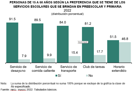 La ENASIC brinda información sobre las opiniones acerca de aspectos relevantes de los servicios que deben ofrecerse en los centros educativos de preescolar y primaria. Entre la población de 15 a 60 años, 91.5 % declaró que se debe otorgar servicio de desayuno; 89.5 %, que se debe dar a las niñas y niños servicio de comida caliente; 84.0 %, que es importante otorgar servicio de transporte y 81.2 %, que la escuela debe promocionar un club de tareas.