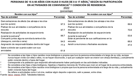 Según la ENASIC 2022, había 31 millones 959 mil 326 personas de 15 a 60 años con hijas o hijos y/ o hijastras o hijastros de entre 0 y 17 años (39.8 %). De estos, 27 millones 582 mil 940 (86.3 %) formaban parte del mismo hogar. Las principales actividades de convivencia que tuvieron fueron demostraciones de afecto (97.3 %), compartieron alguna comida durante el día (94.5 %) y platicaron sobre las amistades o compañeros de la escuela (87.7 %).