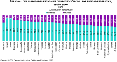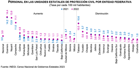 En 2022 había tres servidoras o servidores públicos en áreas de Protección Civil estatales por cada 100 mil habitantes. Las entidades con las tasas más altas de personal de Protección Civil fueron: Guerrero, Nayarit, Campeche y Tabasco, con más de 10 personas servidoras públicas por cada 100 mil habitantes. Hidalgo y Baja California presentaron tasas menores a uno, es decir, por cada servidora o servidor público de protección civil en Baja California, aproximadamente hubo treinta en Guerrero o Nayarit.