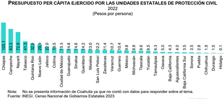 La unidad de Protección Civil de Chiapas ejerció el mayor monto per cápita, con 105 pesos; siguió Campeche, que erogó 83 pesos por habitante. En contraste, las unidades de Protección Civil de Baja California, Aguascalientes, Baja California Sur, Sonora, Puebla, Chihuahua, Durango e Hidalgo ejercieron menos de cinco pesos por habitante cada una.