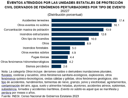 Durante 2022, las unidades de Protección Civil estatales atendieron 45 mil 761 eventos -amenazas o situaciones críticas dañinas generadas por la incidencia de uno o más fenómenos perturbadores; los eventos ocurren en el territorio y representan las situaciones que las unidades de Protección Civil atienden, algunos ejemplos de eventos son las inundaciones, heladas o deslaves-, cifra ligeramente menor a la observada en 2021, año donde se atendieron 45 mil 899 sucesos. De los eventos atendidos en 2022, 17.4 % (7 mil 975) fue accidente terrestre, 13.9 % derivó de la concentración masiva de población y 12.6 % fue incendio.