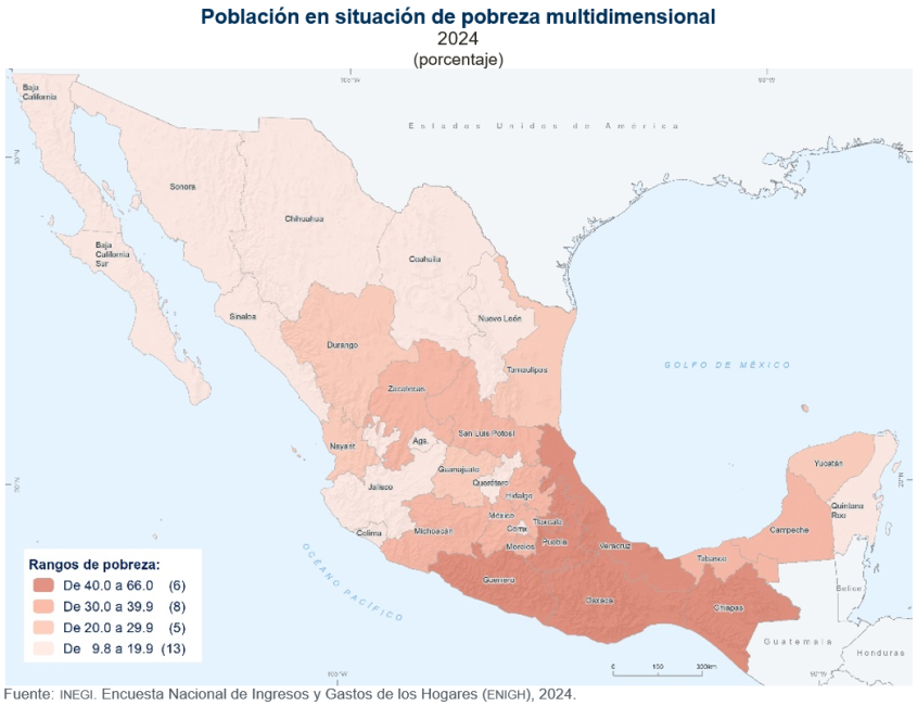 En 2024, las cinco entidades federativas con los porcentajes más altos de población en situación de pobreza multidimensional fueron Chiapas, con 66.0 %; Guerrero, con 58.1 %; Oaxaca, con 51.6 %; Veracruz, con 44.5 %; y Puebla, con 43.4 por ciento. En contraste, las cinco entidades con los porcentajes más bajos fueron Baja California, con 9.9 %; Baja California Sur, con 10.2 %; Nuevo León, con 10.6 %; Coahuila, con 12.4 %; y Sonora, con 14.1 %.