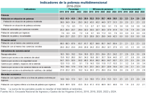 Para identificar a la población en situación de pobreza multidimensional se considera a quienes presentan carencia en al menos uno de los seis indicadores —rezago educativo, acceso a los servicios de salud, acceso a la seguridad social, calidad y espacios de la vivienda, servicios básicos en la vivienda y acceso a la alimentación nutritiva y de calidad— y tienen un ingreso inferior a las líneas de pobreza, según ámbito rural y urbano. Dichas líneas de pobreza por ingreso equivalen al valor monetario mensual de la canasta alimentaria más la canasta no alimentaria, por persona.