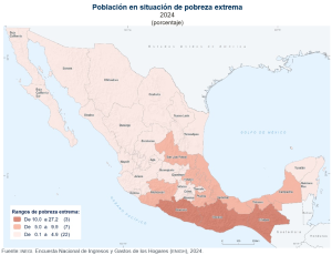 Las cinco entidades con los porcentajes más altos de población en situación de pobreza extrema, en 2024, fueron Chiapas, con 27.1 %; Guerrero, con 21.3 %; Oaxaca, con 16.3 %; Veracruz, con 8.8 %; y Puebla, con 7.3 por ciento. En cambio, las cinco entidades con los porcentajes más bajos fueron Baja California, con 0.4 %; Nuevo León, con 0.5 %; Aguascalientes, con 0.6 %; Coahuila, con 0.8 %; y Colima, con 1.0 %.