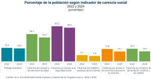 Entre 2022 y 2024 aumentó porcentaje de población vulnerable por carencias sociales en 2.7 puntos porcentuales para ubicarse en 32.2 % en 2024, a pesar de reducirse por acceso a educación, salud, seguridad social, vivienda y alimentación