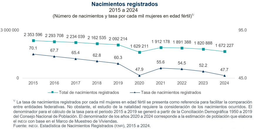 En México, durante 2024, se contabilizaron un millón 672 mil 227 nacimientos registrados. La tasa de nacimientos registrados por cada mil mujeres en edad fértil (15 a 49 años) fue de 47.7.