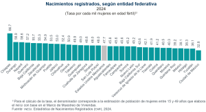 Las entidades federativas con las tasas más altas de nacimientos registrados por cada mil mujeres en edad fértil fueron Chiapas, con 86.7; Durango, con 58.9; y Nayarit, con 58.6. Las más bajas se presentaron en Ciudad de México, con 32.8; Yucatán, con 38.1; e Hidalgo, con 38.3.