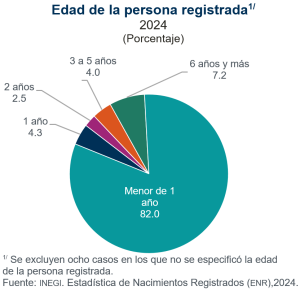 La edad más frecuente en la que se registraron las personas fue cuando contaban con menos de un año. El porcentaje de registros a esta edad ascendió a 82.0. De las personas registradas 7.2 % tenía 6 años y más.
