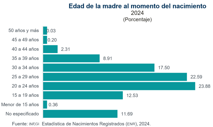 Las madres entre 20 y 24 años de edad al momento del nacimiento representaron 23.88 % del total de nacimientos registrados. Siguieron las que tenían entre 25 y 29 años, con 22.59 por ciento. Un 0.36 % correspondió a madres menores de 15 años. Las categorías por edad se muestran en la siguiente gráfica: