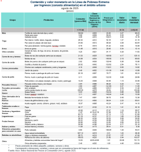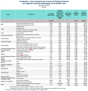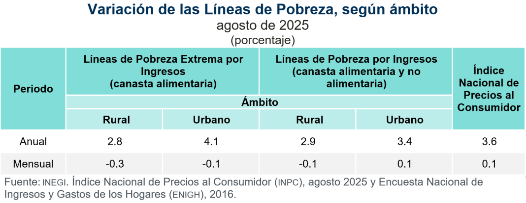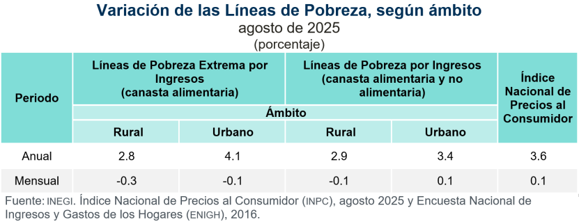En este marco, se da a conocer la actualización de las Líneas de Pobreza (LP), según ámbito rural y urbano, correspondiente a agosto de 2025. El cálculo se realiza con base en el Índice Nacional de Precios al Consumidor (INPC).