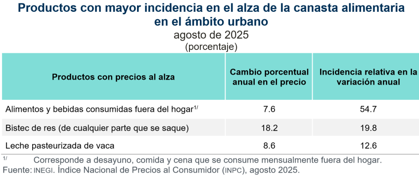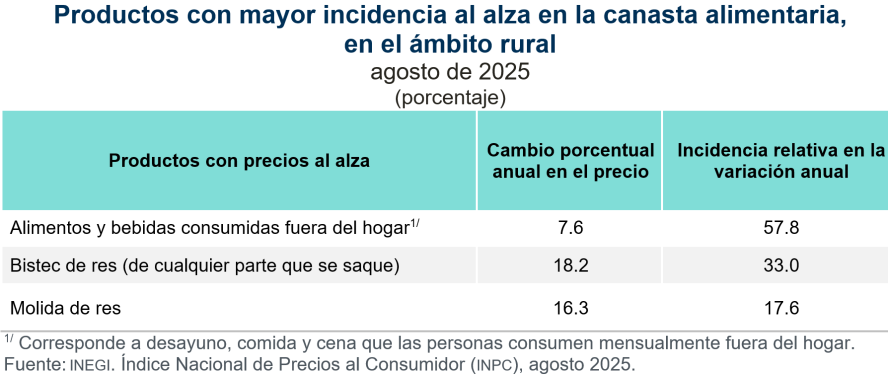 Los rubros de alimentos y bebidas consumidas fuera del hogar, así como el de bistec de res (de cualquier parte que se saque), fueron los que más contribuyeron al incremento anual del valor monetario de la canasta alimentaria. Ambos presentaron mayor incidencia en el ámbito rural. En este, la molida de res fue el tercer rubro que más contribuyó al aumento de la canasta alimentaria.