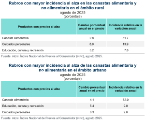 En agosto, costo de canasta alimentaria presentó crecimiento anual de 2.8 % en el ámbito rural y de 4.1 % en el urbano