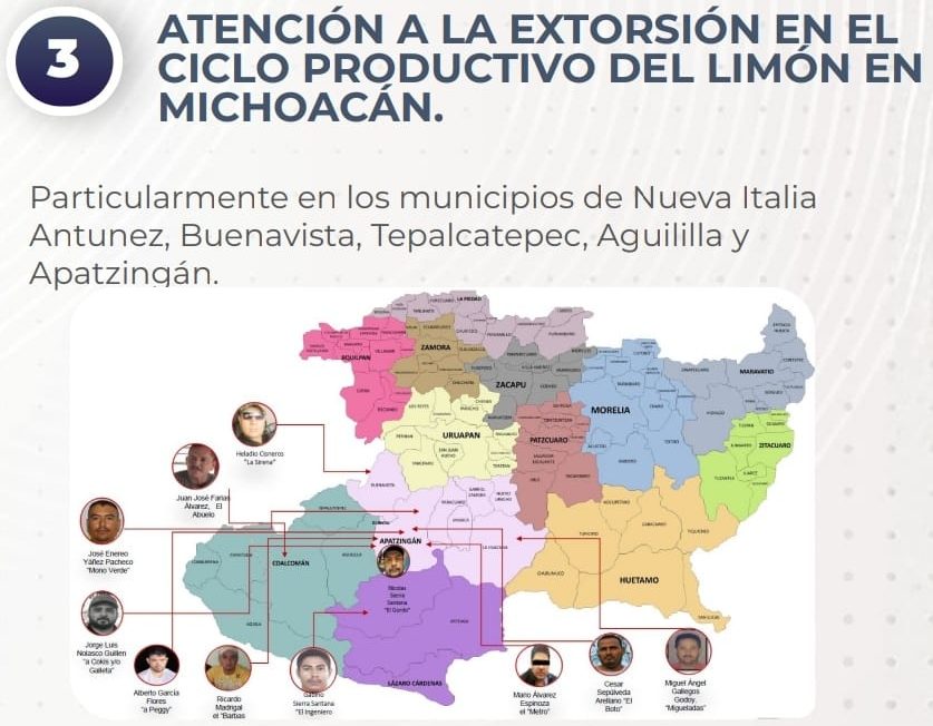 En la estrategia nacional de seguridad presentada este martes, el gobierno federal contempla la atención y acciones contra la extorsión a productores de limón en Michoacán.