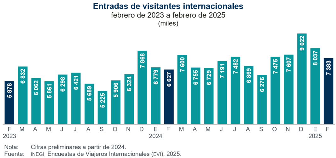 En febrero de 2025 ingresaron al país 7 millones 383 mil 300 visitantes, 11.4 % más que en el mismo mes de 2024. De esta cantidad, 3 millones 723 mil 726 (50.4 %) fueron turistas internacionales —viajeras y viajeros residentes en el extranjero que pernoctaron en México—, 7.8 % superior a la de igual mes de un año antes, y 3 millones 659 mil 574 (49.6 %) fueron excursionistas —visitantes que no pernoctaron en su viaje—.