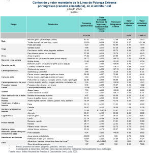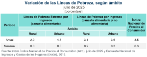 En julio de 2025, los cambios porcentuales anuales de las Líneas de Pobreza Extrema por Ingresos (LPEI), referentes a la canasta alimentaria, fueron de 2.9 % en el ámbito rural y de 4.3 % en el urbano. El cambio en el ámbito rural se ubicó por debajo de la inflación general anual (3.5 %), mientras que, en el caso del urbano la superó. Respecto a julio de 2024, la variación en las LPEI disminuyó 5.0 puntos porcentuales en el ámbito rural y 3.0 puntos porcentuales en el urbano (estas eran de 7.9 y 7.3 %, respectivamente).
