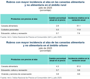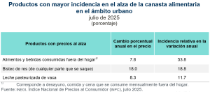 Los rubros de alimentos y bebidas consumidas fuera del hogar, así como el de bistec de res, fueron los que más contribuyeron al aumento anual de la canasta alimentaria. Ambos presentaron mayor incidencia en el ámbito rural. En este, la molida de res fue el tercer rubro que más contribuyó al aumento de la canasta alimentaria. En el urbano, fue la leche pasteurizada de vaca.