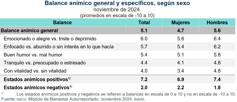 En noviembre de 2024, el balance anímico general tuvo un promedio de 5.1. Los hombres reportaron una mayor presencia de estados de ánimo positivos y alcanzaron un promedio de 5.6. Las mujeres, en comparación con los hombres, dieron mayor peso a los estados negativos, pues presentaron un balance general de 4.7, en promedio.