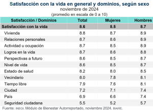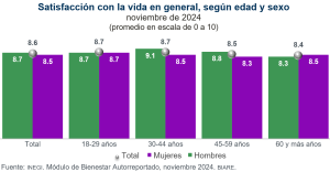 En noviembre de 2024, la satisfacción con la vida en general tuvo un promedio de 8.6. Los hombres calificaron este indicador dos décimas por encima de las mujeres, con 8.7 frente a 8.5.