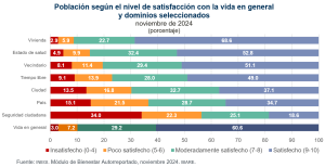 Las personas también evalúan la satisfacción que tienen con 12 aspectos de su vida o dominios específicos. En noviembre de 2024, se identificaron 4 dominios con promedios superiores a la satisfacción general con la vida: vivienda, con promedio de 8.8; relaciones personales, actividad u ocupación y logros en la vida, con 8.7. Otros 2 dominios obtuvieron un promedio igual al de la satisfacción con la vida en general: perspectivas a futuro y nivel de vida. En contraste, los 6 ámbitos restantes presentaron niveles por debajo del promedio general: estado de salud, con 8.2; vecindario, con 8.0; tiempo libre, con 7.9; ciudad, con 7.2; país, con 6.9, y seguridad ciudadana, con 5.5. Los resultados señalan áreas en las que la evaluación de la satisfacción de la población adulta es menor, lo que sugiere posibles focos de atención para mejorar el bienestar.