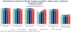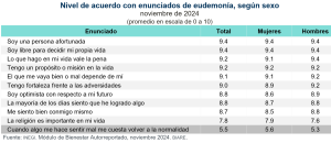 El último aspecto del bienestar subjetivo es la eudemonía. Esta evalúa el nivel de acuerdo de las personas con 11 enunciados. Un mayor acuerdo con los primeros 10 indica una mayor fortaleza y sentido de vida, mientras que un mayor acuerdo con el último refleja menor fortaleza. Los enunciados con los que la población estuvo más de acuerdo son soy una persona afortunada y soy libre para decidir por mi propia vida, con promedio de 9.4; y el enunciado de menor valor de aquellos con valencia positiva fue la religión es importante en mi vida, con promedio de 7.8. Por otro lado, el enunciado con valencia negativa, cuando algo me hace sentir mal me cuesta volver a la normalidad, obtuvo una calificación de 5.5 en promedio.