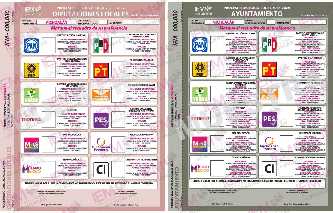 El Consejo General del Instituto Electoral de Michoacán (IEM) aprobó por unanimidad los diseños y especificaciones técnicas de la documentación electoral con emblemas validados por el Instituto Nacional Electoral (INE), para las elecciones de diputaciones y ayuntamientos que se utilizarán en el Proceso Electoral Local 2023-2024.