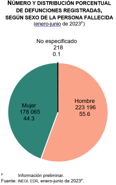 En el primer semestre de 2023, del total de defunciones registradas de forma preliminar, 55.6 % correspondió a hombres y 44.3 %, a mujeres. En 218 casos (0.1 %) no se especificó el sexo de la persona.