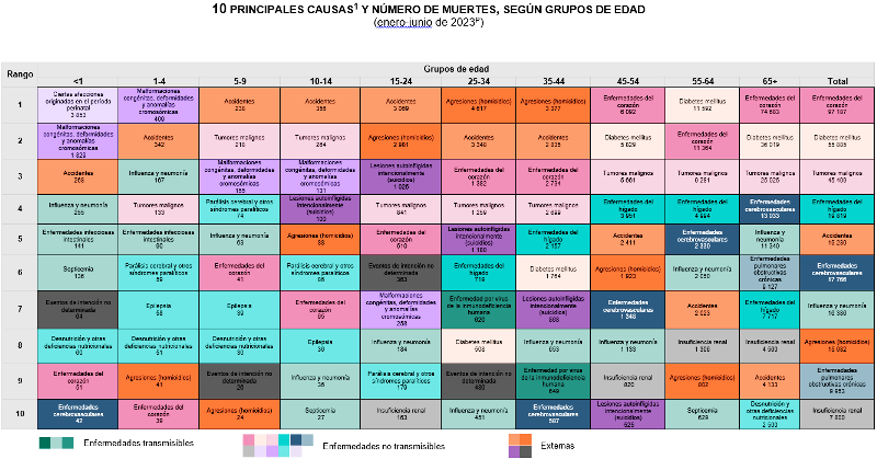 Aunque la metodología para determinar las principales causas para México prescinde de la categoría que integra los eventos de intención no determinada, por corresponder a una categoría residual entre las defunciones accidentales y violentas, en este documento se considera para completar el espectro de este tipo de defunciones. Aunque en la presente publicación la categoría en cuestión no se ubicó entre las principales 10 causas a nivel nacional, sí está presente en el desglose por grupos de edad.