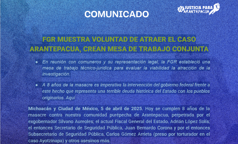 Gracias a la manifestación y acciones de visibilidad que realizamos en este aniversario en la CDMX, en mesa de trabajo este día, la representación jurídica del Consejo Comunal Indígena de Arantepacua y la FGR acordaron iniciar un periodo de dos meses de trabajo para analizar detenidamente las posibilidades de atracción del caso al fuero federal. Después de esos dos meses de trabajo la FGR se comprometió a acudir a la comunidad a anunciar si atrae o no el caso.
