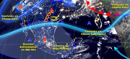Un segundo canal de baja presión al interior del territorio nacional y la entrada de humedad del Océano Pacífico y Golfo de México, propiciarán lluvias puntuales fuertes en el Estado de México y Morelos. Por otra parte, un sistema de baja presión en altura sobre el suroeste de Estados Unidos y la corriente en chorro polar sobre el noroeste del país, favorecerán lluvias aisladas en Baja California, así como rachas de vientos de 60 a 70 km/h y tolvaneras en Baja California, Sonora y Chihuahua.