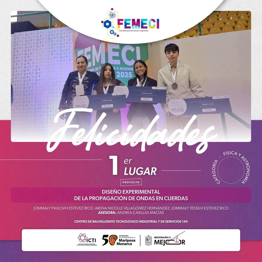 La directora del Instituto de Ciencia, Tecnología e Innovación (ICTI), Alejandra Ochoa informó que el primer puesto fue para el proyecto «Diseño experimental de la propagación de ondas en cuerdas», desarrollado por Jommaly Pavlovh, Arena Villagómez y Jommaly Estevez, del Bachillerato Tecnológico Industrial y de Servicios (CBTis) 149, en la categoría de Física y Astronomía.