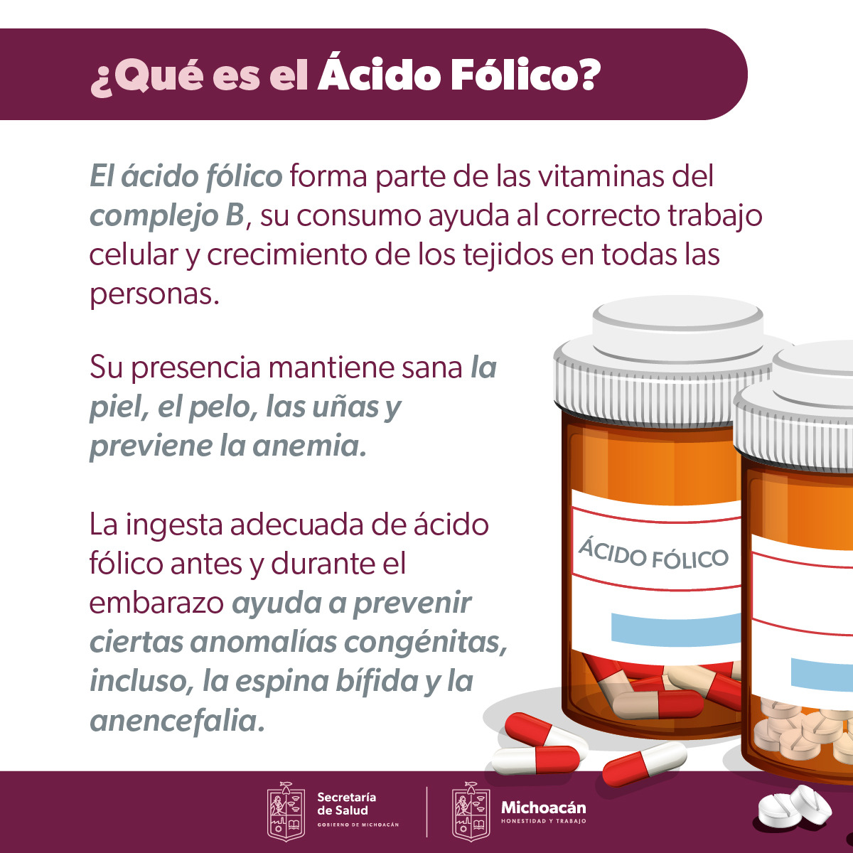 El Gobierno de Michoacán tiene garantizado el abasto del ácido fólico en los 364 centros de salud de la entidad, pues su presencia mantiene sana la piel, el pelo, las uñas y previene la anemia, sobre todo en las mujeres embarazadas, quienes lo deben consumir para prevenir ciertas anomalías congénitas como la espina bífida y la anencefalia, aunado a un buen control prenatal.